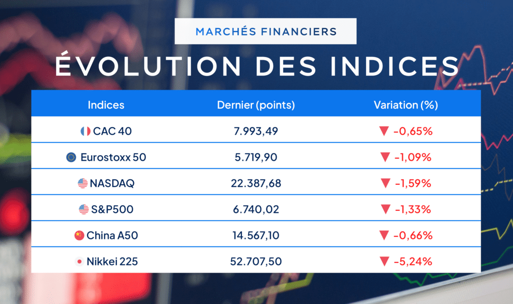 Données au 09-03-2026 (8h53) Source : https://fr.investing.com/indices/major-indices
