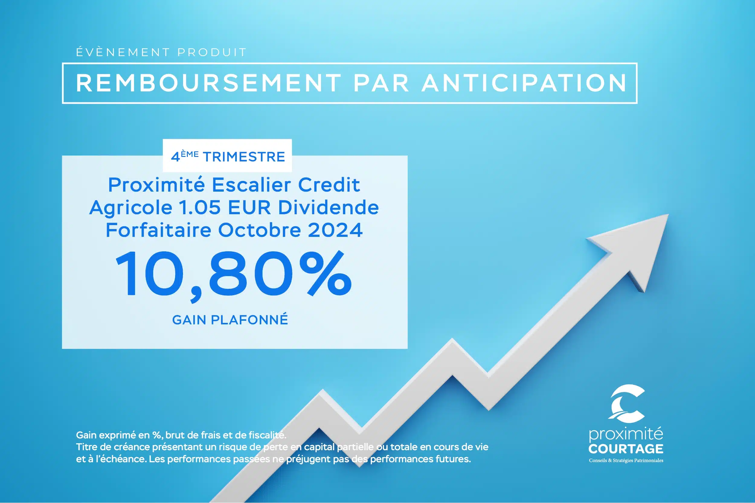 Un rappel par anticipation Le support d’investissement Proximité Escalier Crédit Agricole 1.05 EUR Dividende Forfaitaire Octobre 2024(1), conseillé par notre cabinet en 2024, a été ...