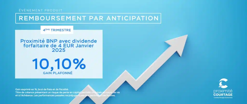 Le support d’investissement Proximité BNP avec dividende forfaitaire de 4 EUR Janvier 2025(1), conseillé par notre cabinet en 2025, a été rappelé par anticipation dès le 4ème trimestre (le 20/01/2026).