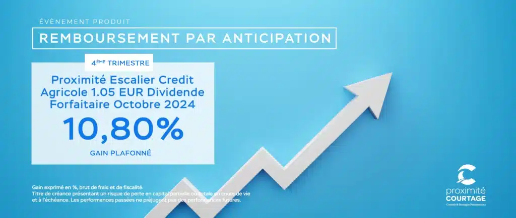 Le support d’investissement Proximité Escalier Crédit Agricole 1.05 EUR Dividende Forfaitaire Octobre 2024(1), conseillé par notre cabinet en 2024, a été rappelé par anticipation dès le 4ème trimestre (le 15/10/2025).