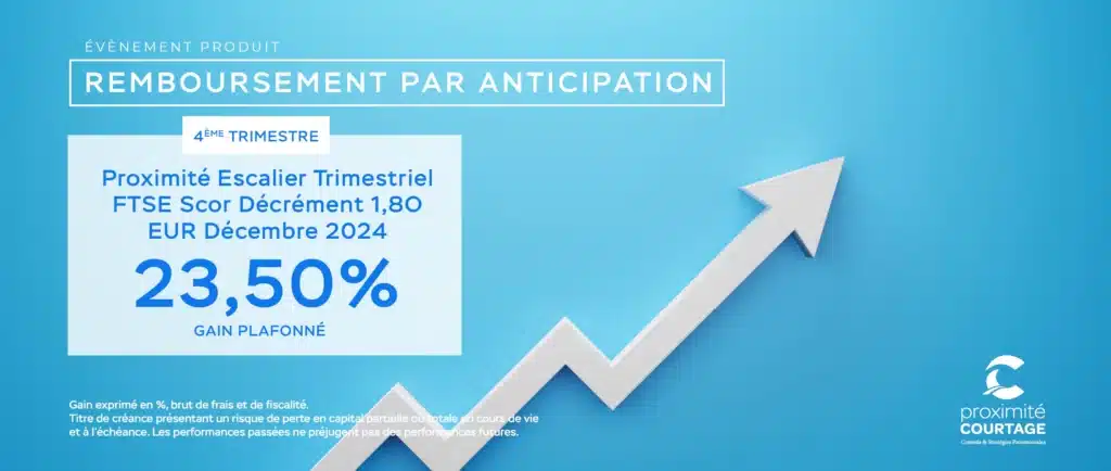 Le support d’investissement Proximité Escalier Trimestriel FTSE Scor Décrément 1,80 EUR Décembre 2024(1), conseillé par notre cabinet en 2024, a été rappelé par anticipation dès le 4ème trimestre (le 08/12/2025).
